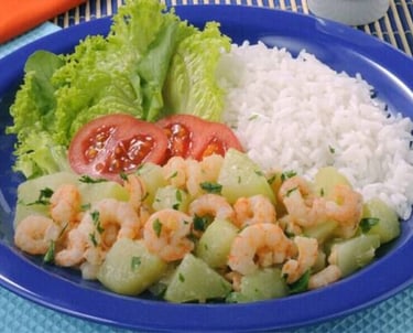 2- Arroz branco + grão de bico carne moída refogada + abobrinha refoga + salada