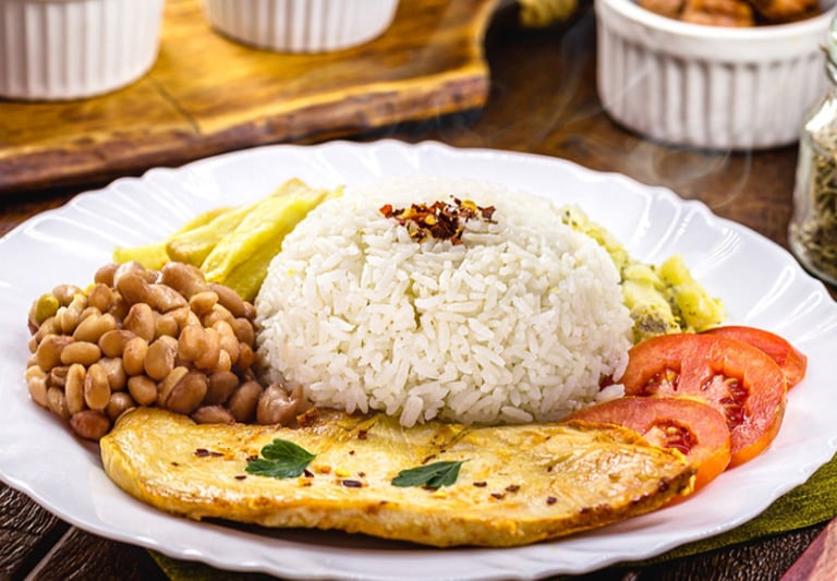 1- Arroz integral + feijão +frango grelhado + brócolis refogado + salada